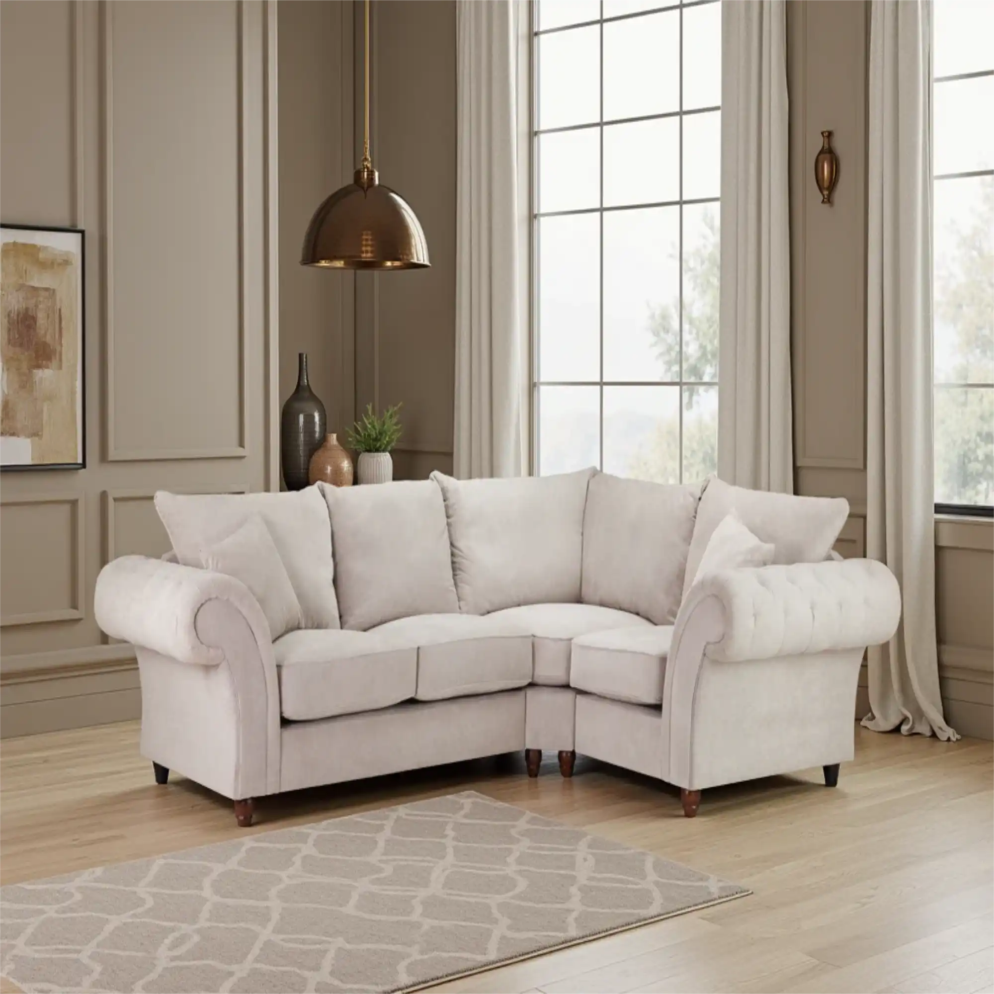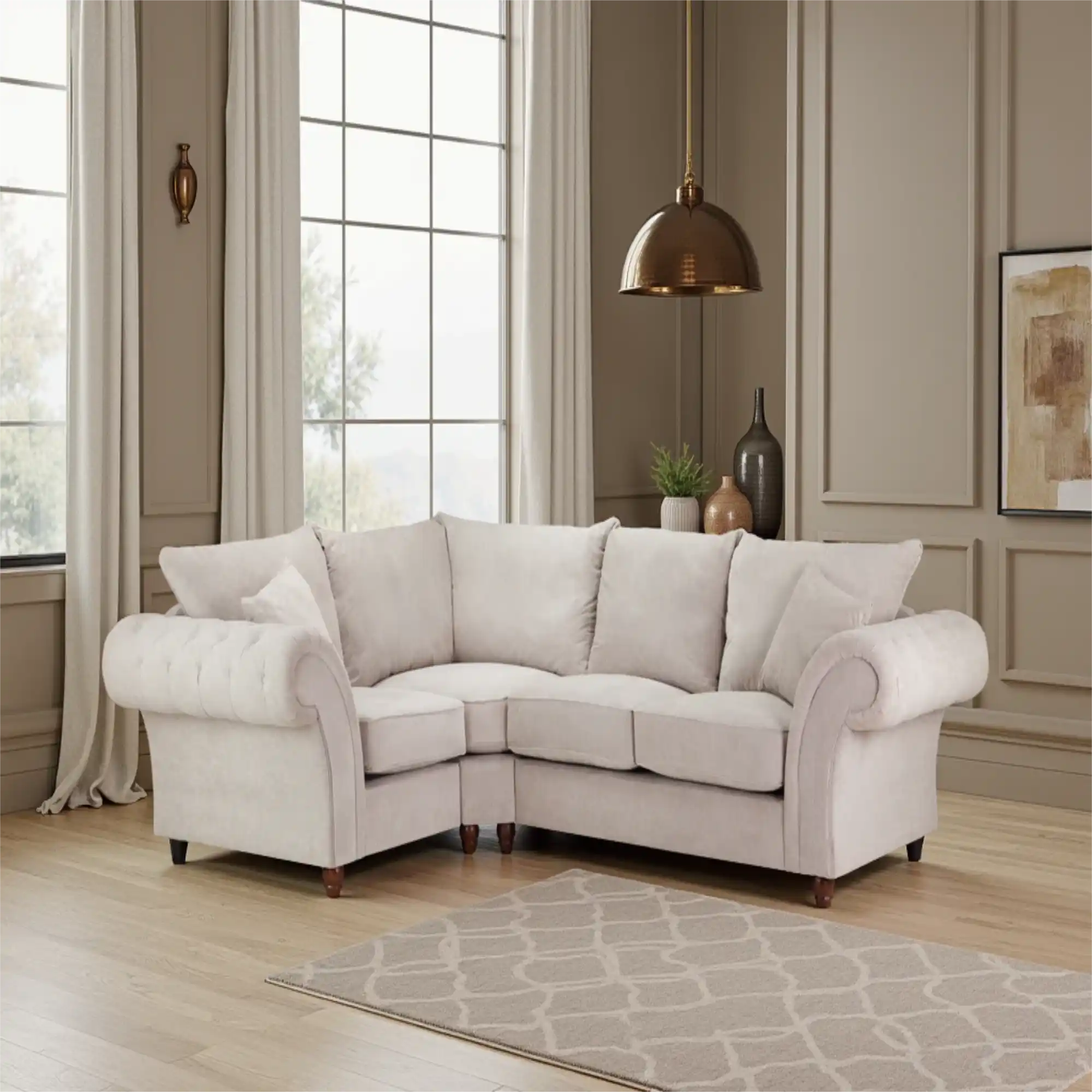 The Ashwin Corner Sofa combines luxurious grey velvet, elegant tape button detailing, and premium comfort in a stunning L-shaped configuration.