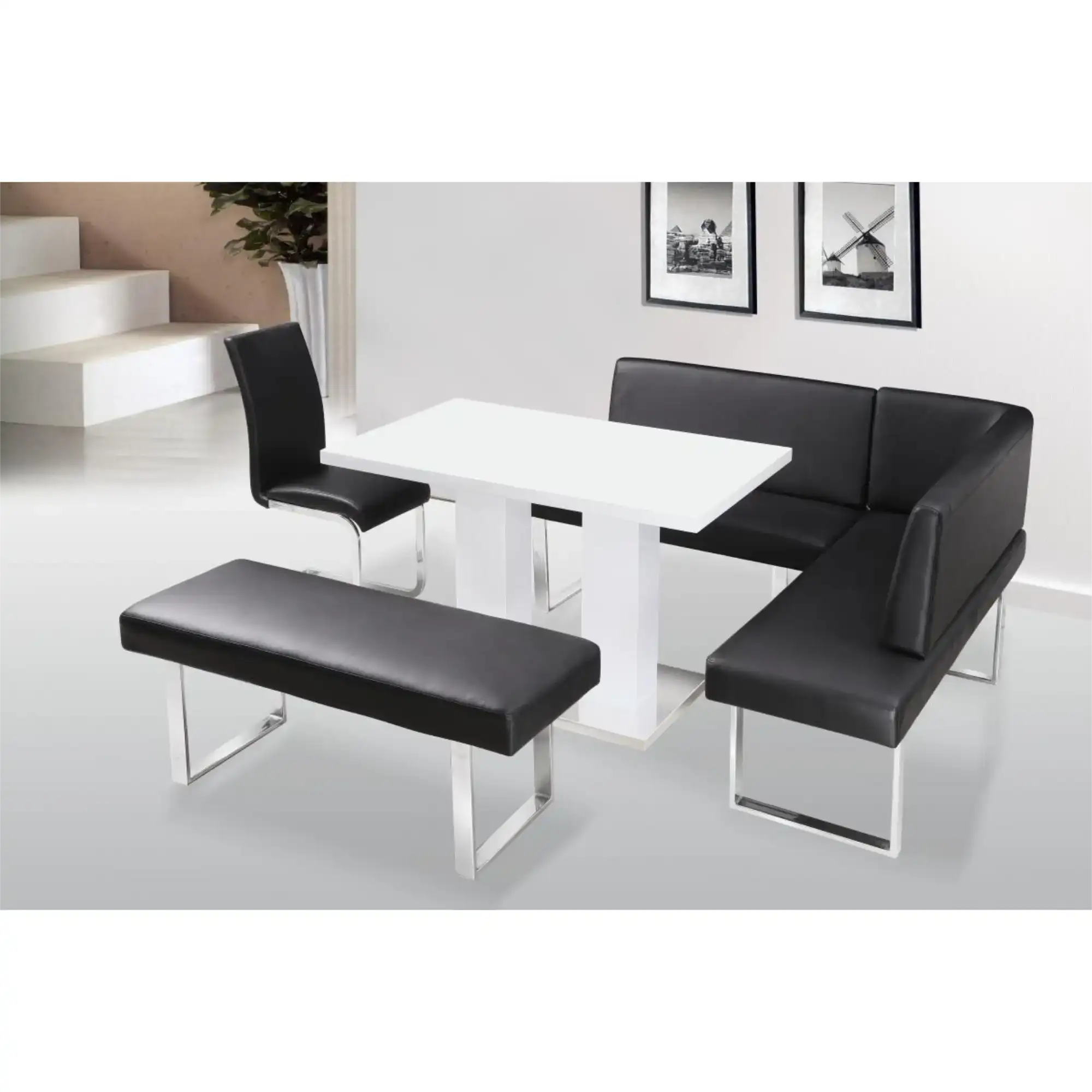 Corner Bench with Back in White PU and Chrome legs