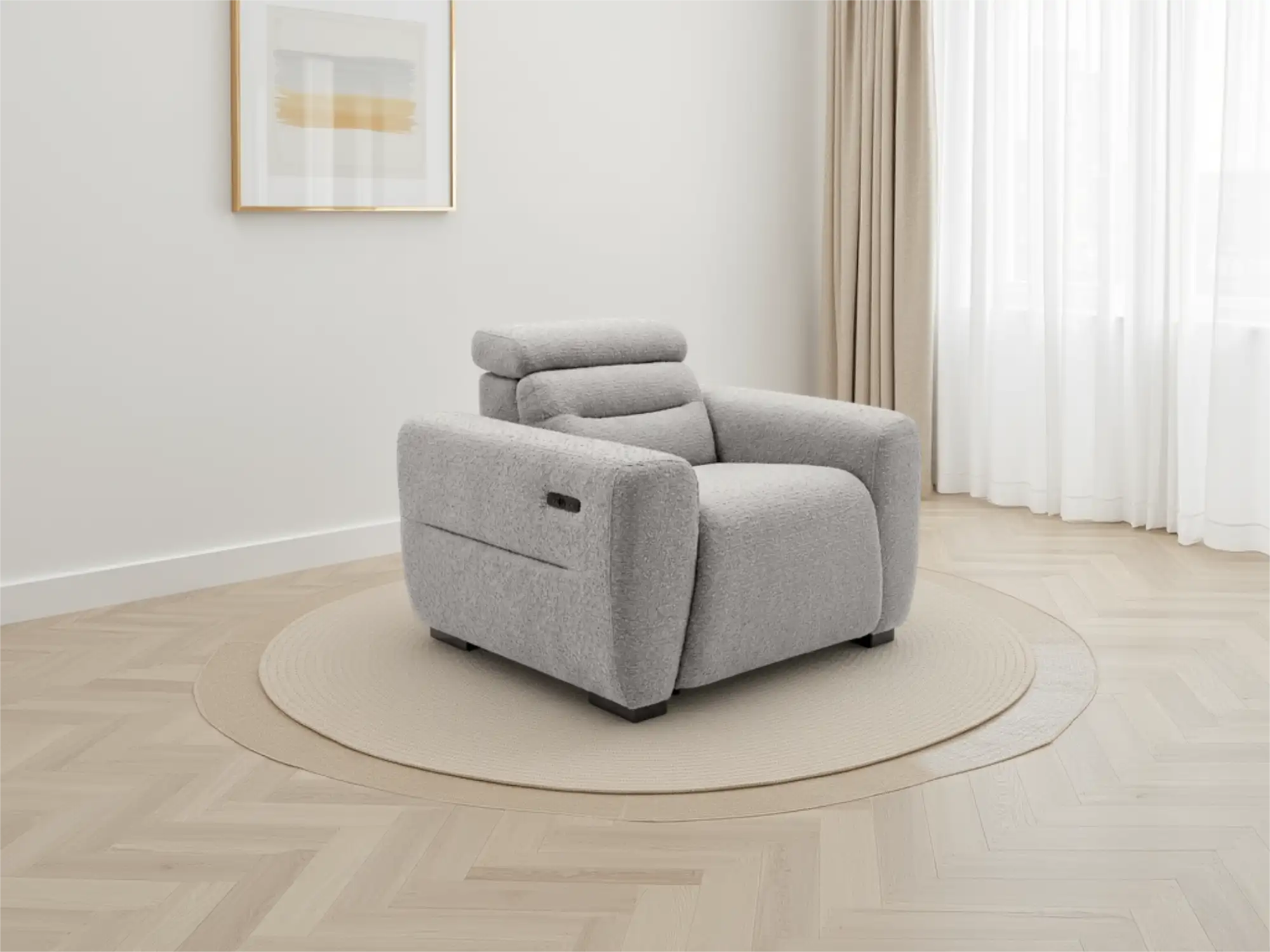 Sophisticated Grey Boucle Electric Power Recliner Armchair with USB Charging and Adjustable Headrest